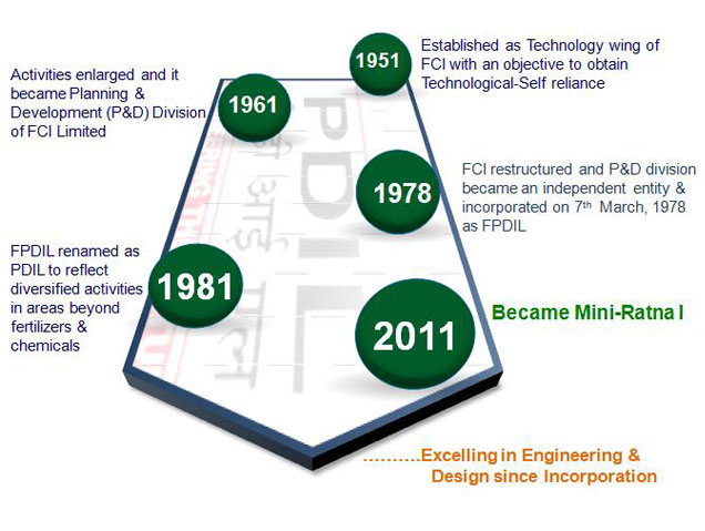 - वर्ष 1951 में तकनीकी आत्मनिर्भरता प्राप्त करने के उद्देश्य से भारतीय उर्वरक निगम लिमिटेड की एक तकनीकी इकाई के रूप में पी डी आई एल की स्थापना की गई।